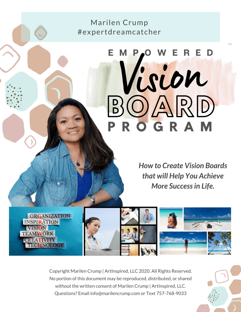 There is so much POWER in the use of Vision Boards – You just have to discover the principles of how to create the flow of success. Marilen Crump #expertdreamcatcher has been teaching people the benefits of developing an INTUITIVE MINDSET for over 10 years through her company ARTINSPIRED, LLC. Together with her husband, Kenneth Crump, they have run workshops, retreats, and events to help their empower their community.